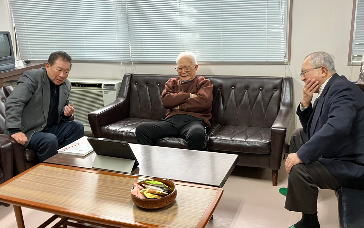 | 令和8年1月30日、選抜甲子園21世紀枠出場校発表を、かつての優勝ナイン伊藤氏(30年度卒)・野球部OB会会長川崎氏(50年度卒)・二度目の夏の甲子園出場時の応援団長森氏(43年度卒)を同窓会館にお迎えして見守りましたが、残念ながら叶いませんでした。 お三方からは今後への期待の言葉をいただきました。 |