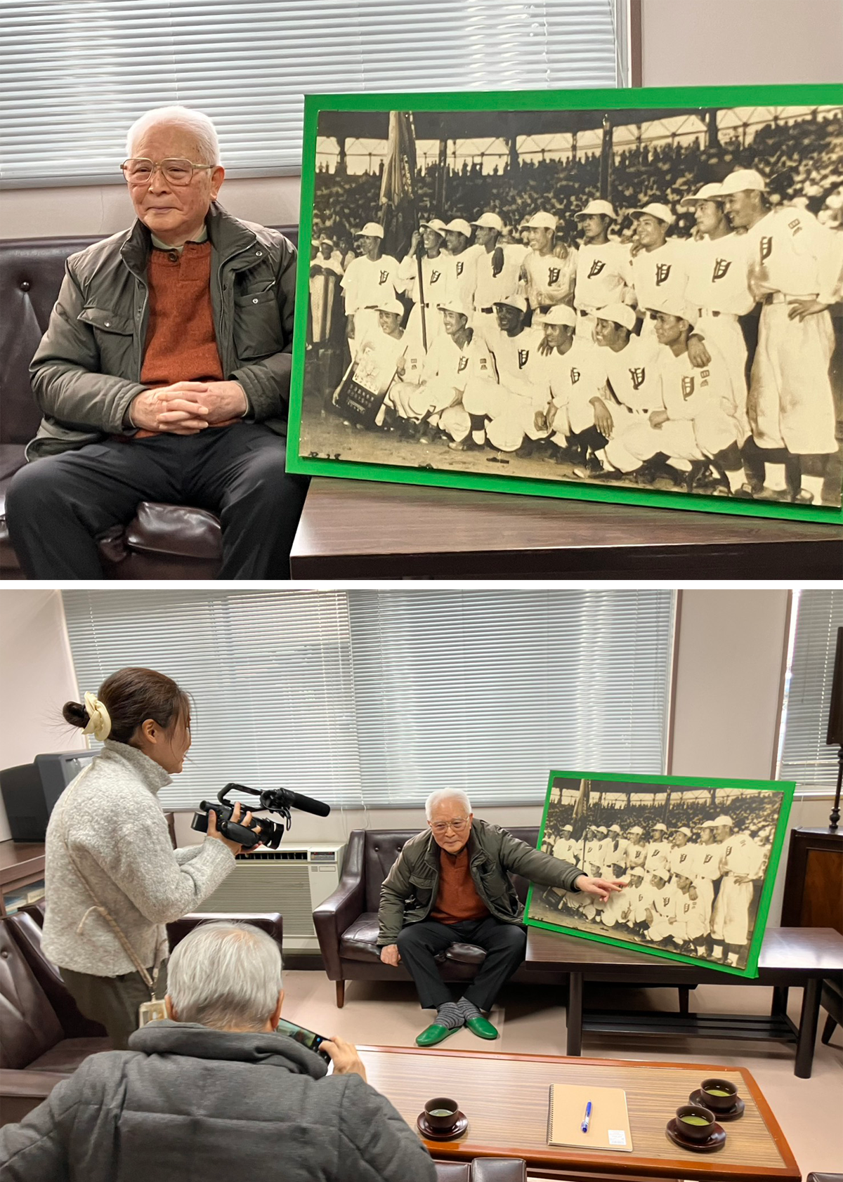 | 令和5年8月、CTY番組「まほろば ~歴史の扉~」にて野球部甲子園初出場初優勝が取り上げ られました。それに先立ちまして、優勝ナインから成瀬氏・伊藤氏、当時の応援団員西脇氏への取材 が行われました。 |