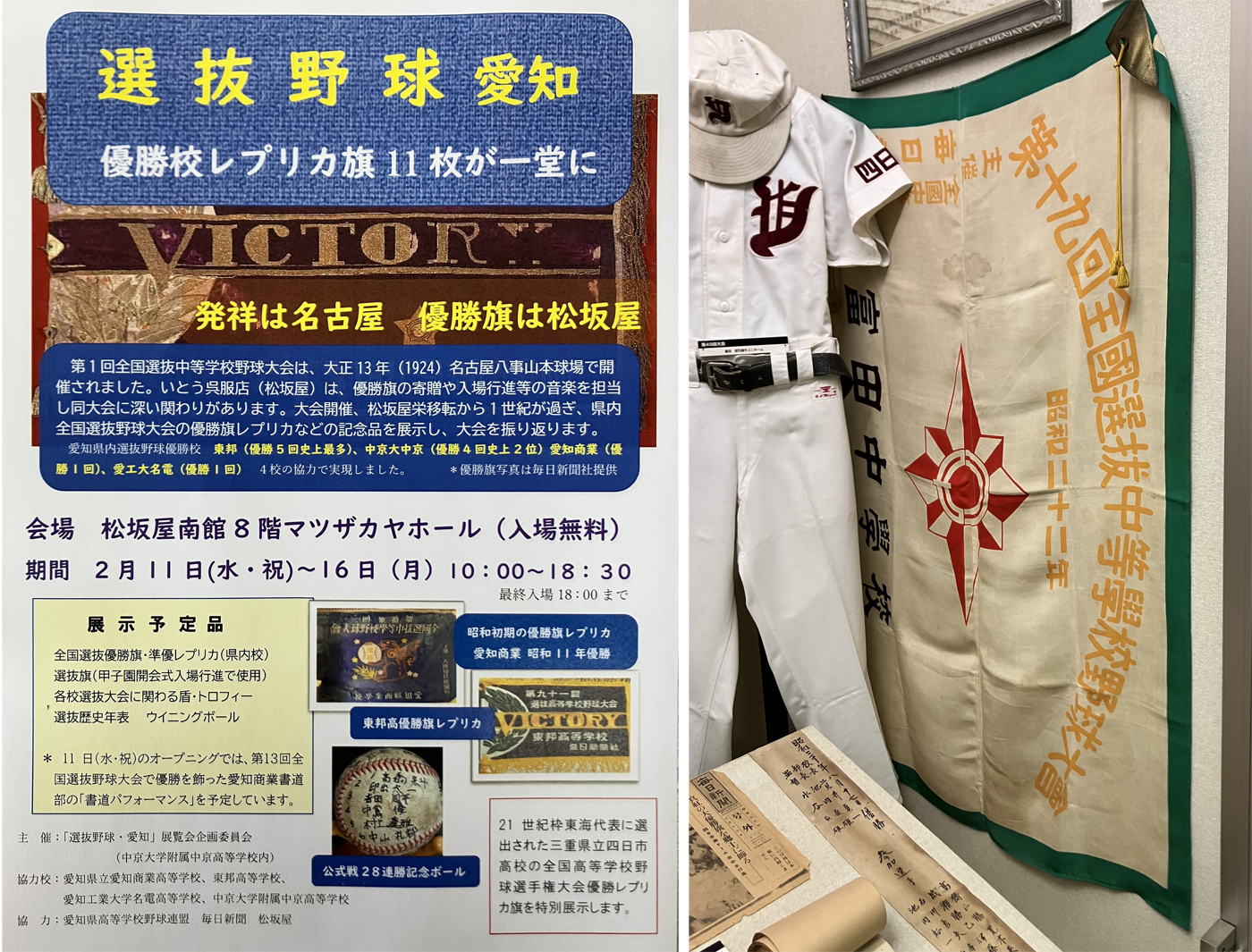 | 令和8年2月11日~16日、松坂屋南館8階マツザカヤホールに於いて、選抜高校野球に関しての展示が行われます。四高からは37回夏の甲子園大会の優勝旗と、同窓会館所蔵の昭和22年富中時代の第19回選抜出場旗が展示されます。 |